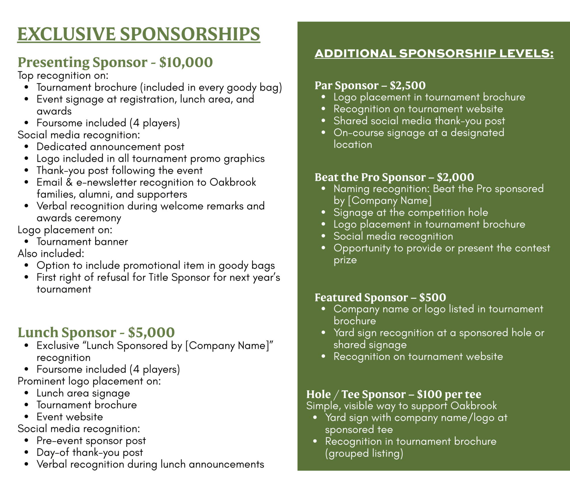 Sponsorship opportunities are available for businesses, families, and friends of Oakbrook Preparatory School. Sponsors receive recognition before, during, and after the tournament.